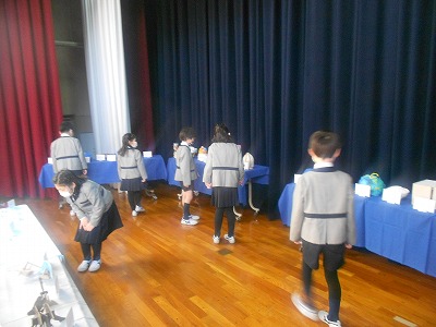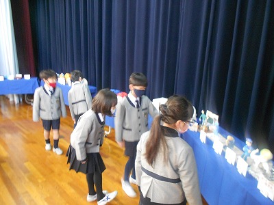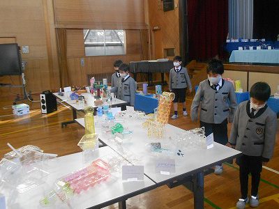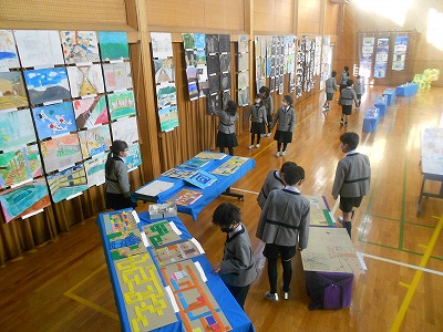 1校時の前半、体育館の作品展に他学年の作品を見に行きました。