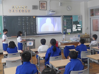 中間休みの前半、ブックワールド係の2人が読み聞かせをしてくれました。