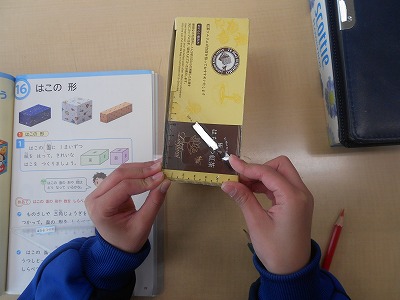 「はこの形」の学習に入りました。今日は、お家から持って来てもらった空き箱を使って、面の形や数を調べる活動に取り組みました。