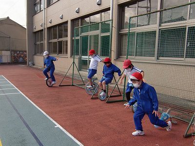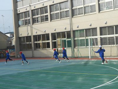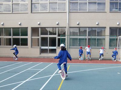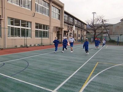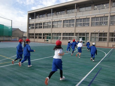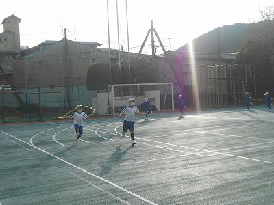 前跳び・後ろ跳び・ケンケン跳びなどを練習した後、かけ足跳びで運動場を2周しました。