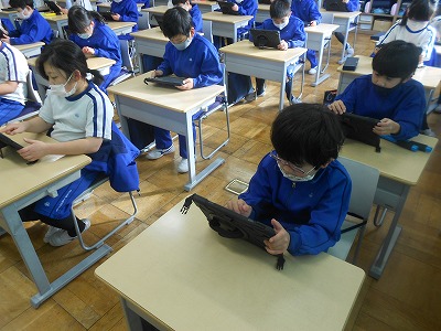 縄跳びの後は、手洗い・消毒・水分補給を済ませ、タブレットを用いて「あいさつ返しキャンペーン」の色塗りをしました。