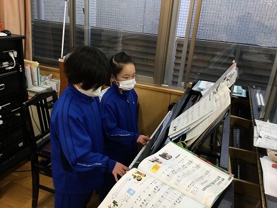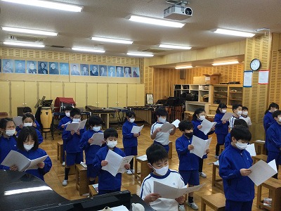 全校で練習している「♪夢の世界を」と「♪マイバラード」を歌っています。“6年生ありがとうの会”で、全校で声合わせができるといいなと計画しています。