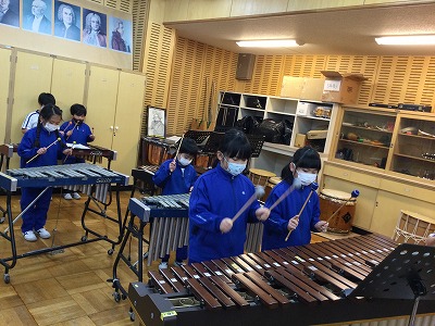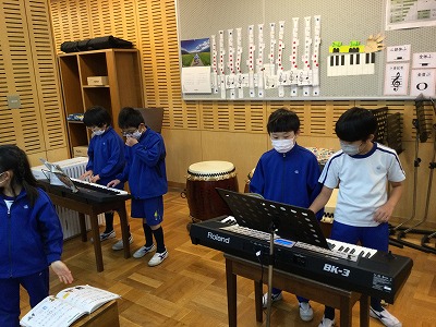 後半の活動は「チャチャマンボ♪」の合奏です。先週に練習済みの伴奏パートを念入りに練習し、もう一つのグループの歌声と合わせます。