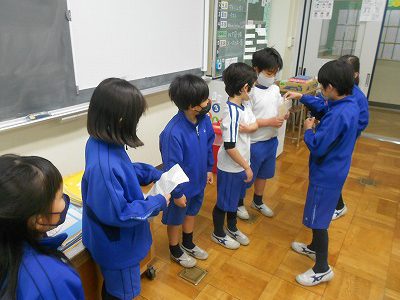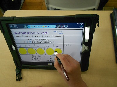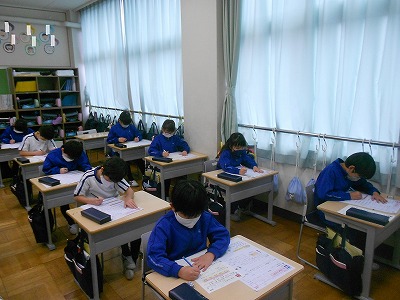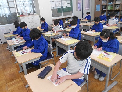 計算ドリルや黄色かるたの暗唱テストをした後、今朝の挨拶を振り返りました。