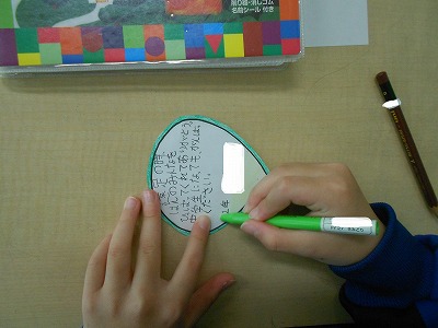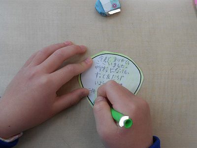 前半は、れんげ班の班長さんに贈る「ありがとうプレゼント」のメッセージを書きました。