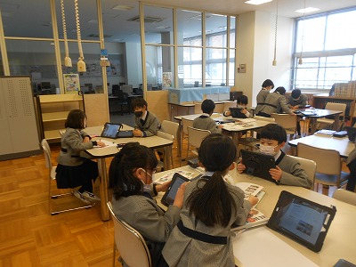 〈挨拶〉〈食べ物〉〈学校生活〉など、グループ毎に本やタブレットを用いて調べています。