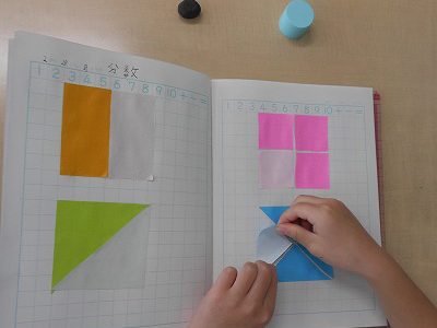 後半は、そのプリントを参考に、折り紙で「二分の一」や「四分の一」を作りました。