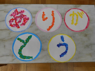 文字の大きさや色を考えながら、折り紙を細かく貼って「ありがとう」の文字ができました!