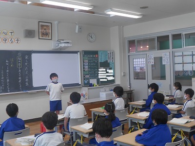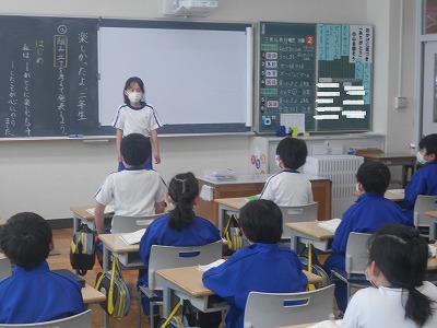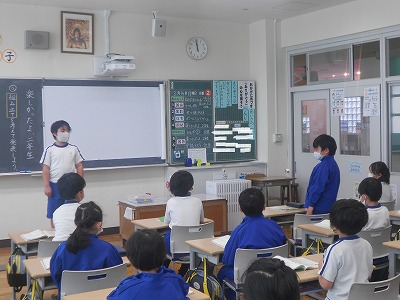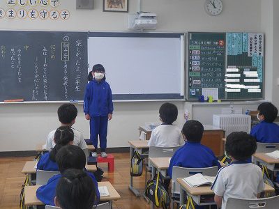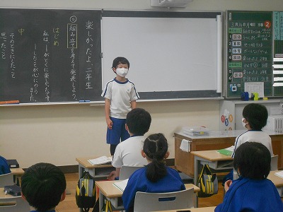 「はじめ・中・終わり」の組み立てを考えながら、一輪車に乗れるようになったことや計算が速くなったことなどみんなの方を向いてしっかりと話すことができました。