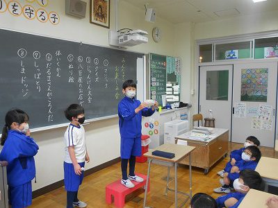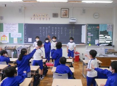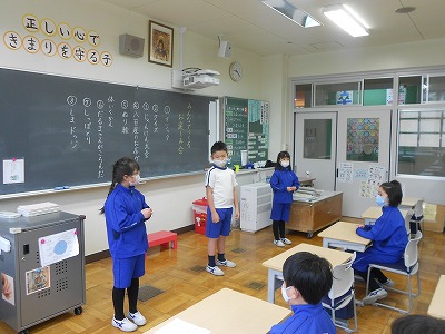 学級代表の2人が前に出て、“みんなで楽しく過ごしましょう!”“静かに話を聞いて協力しましょう!”と呼びかけてくれました。