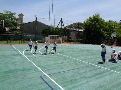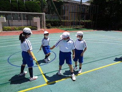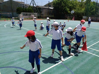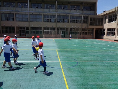 前半は、バトンリレーの学習です。バトンの受け渡しはまだまだ練習が必要ですが、日差しが照りつける中、元気に活動していました。
