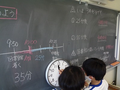 2年生での既習事項を確認し、時刻や時間を求める問題に取り組みました。