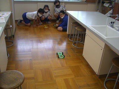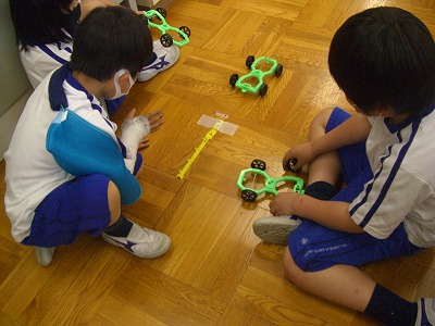床のマス目を数えることで、それぞれの車の進む距離を調べて記録し、比べます。