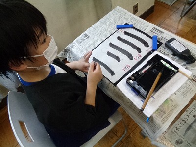 肘を横に上げ、筆を立てて書くことを意識して取り組みました。