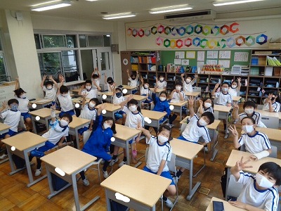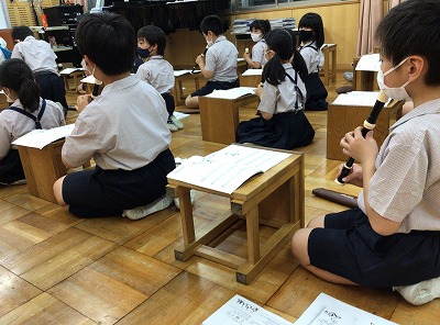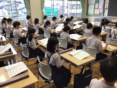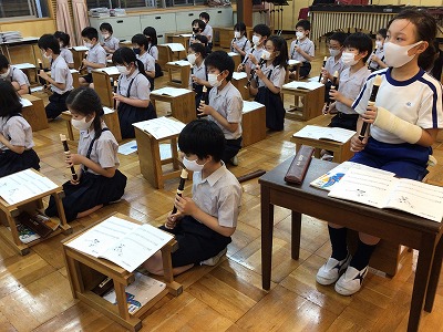 音楽室では、リコーダーテキスト「笛星人」から、「ソ・ラ・シ」の階名唱ができる曲を練習しました。“エア”ならでは…の練習は、階名唱をしつつリコーダーの指を動かせるという“技(わざ)”です。