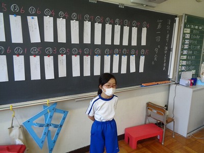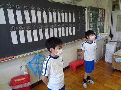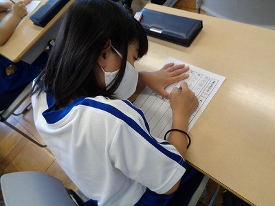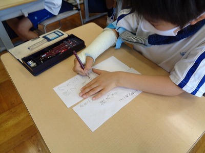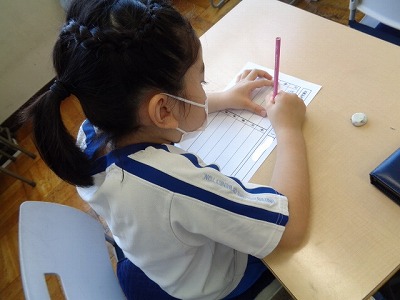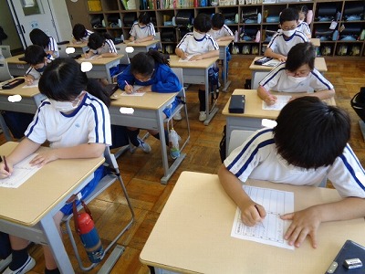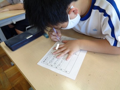 中には、担任が読み上げる前に書き進めている子も。しっかりと週末に勉強していることが うかがえます。