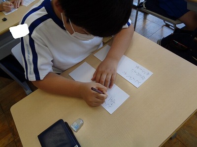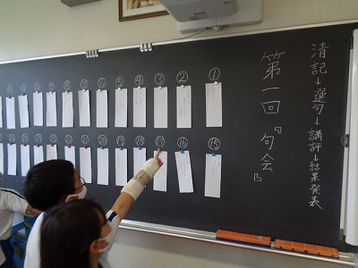 事前に仕上げた子ども達の俳句を、裏返しにしたまま混ぜ合わせて配り直し、配られた句を各自で丁寧に写し直す活動です。