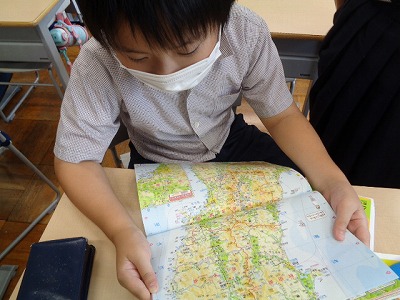 学習の前半は、地図帳の学習です。地図帳から地名を探す活動です。
