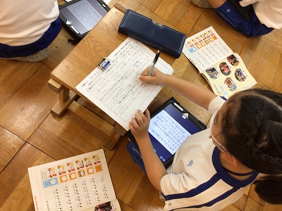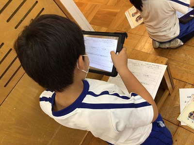 このあと、音楽では初導入のタブレットを活用し、自分が書いたプリントをカメラ機能で取り込んでもらいます。教師の“指令?!”をみんなで読み合い、「はいはーい!お任せあれ!」とばかりに、パシャッが、音楽室に響きました。