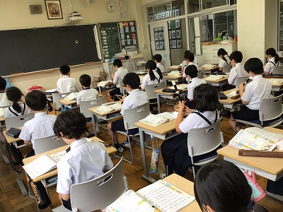 6年生が歌う「♪マイバラード」の二部合唱(録音)を聞いて、感想を発表し合うところから、音楽が始まりました。
