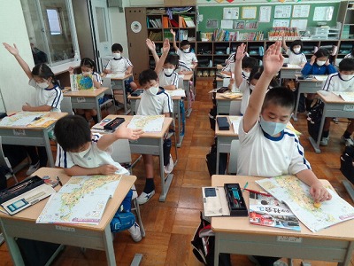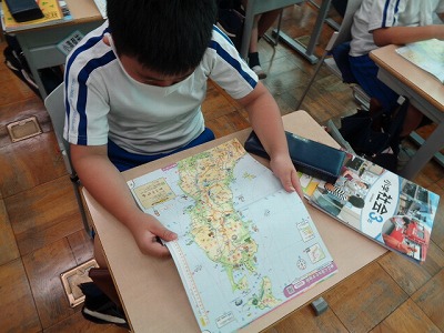 地図帳を使った学習です。地名探しと地図マスターへの道に取り組みました。
