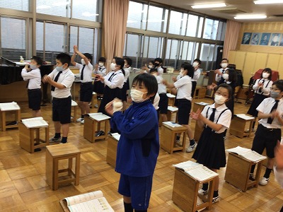 「咲かせよう ぼくらの花を 世界に虹を架けよう!」と歌う時は、世界を表す地球を形取った手の動きや、2の指で虹を弧に描く動きで表します。「もう一回歌おう!」と嬉しい言葉が返ってきました。