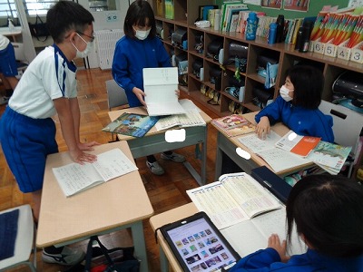 ロイロノートのテキストで紹介したり、実際に本を提示して説明したり、と工夫した発表を考えていました。