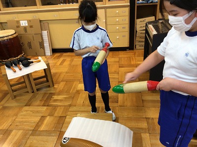 順番が回ってくると、手指の消毒をして、自分の考えたリズムに合った楽器を選びます。