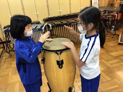 ずんっとお腹に響く「コンガ」も大人気です。太鼓の面を押さえたときと、離したときで響きが変わります。その技法も伝授して(!?)いるので、どしどし使ってほしいところです。