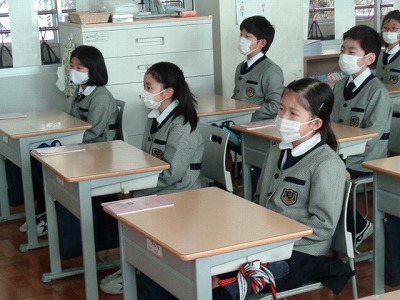 学校長が礼拝の中で話された「身の回りの物を大切にすること」について、全体で確認しました。自分自身が出来ているか、出来ていないのかを見つめ直す時間です。落とし物が多い、丁寧に片付けないなどの反省があがります。