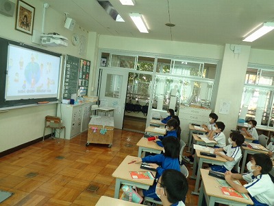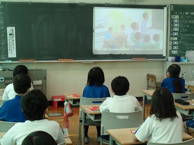 4校時の後半、ユニセフ募金がどんな支援につながっているのかについて、絵本「ユニセフとえがおのひみつ」を通して学ぶ時間を設定しました。
