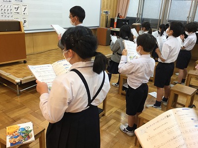 「♪まほうのチャチャチャ」を重ねて歌うことにチャレンジしました。「ア」「イ」「ウ」のそれぞれのメロディを、別のグループが歌うと、二部合唱のように聞こえ、美しく響きます。