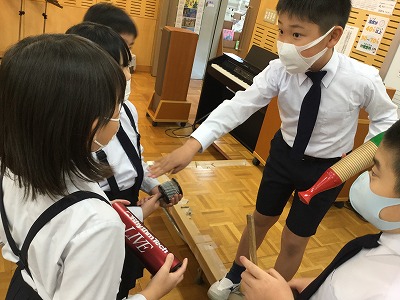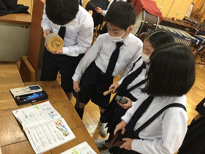 歌唱の後は、リズムパターンの練習も行いました。リズム楽器に持ちかた練習も、集中して取り組んでいました。