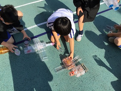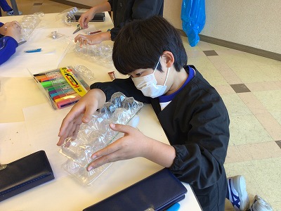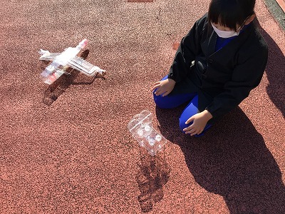 プラスチック素材の特性を活かして、太陽の光の下に置いてみて、反射や光の通り方も楽しみました。