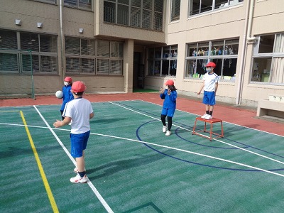 教室で学習の流れを説明した後、グラウンドに出て、チェストパスやドリブルの練習をしました。