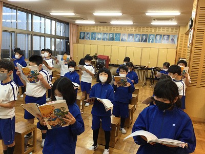 みんなで5番までの歌詞を音読し、場面ごとの“ストーリー”を理解しました。