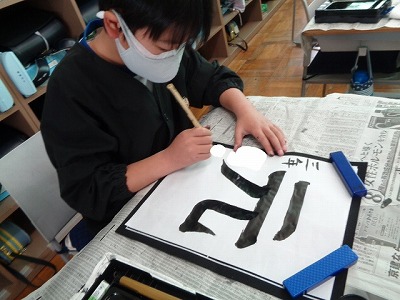 今日の毛筆学習は、「曲がりの筆使い」をテーマに『元』の字を書きました。