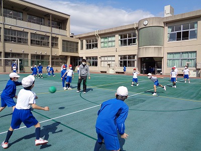 多くの3年生がグラウンドに出て、ドッジボールに参加していました。