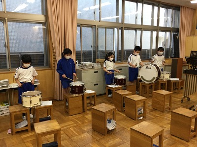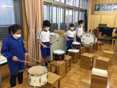 今日は、打楽器パートを取り入れました。鼓笛隊用の小太鼓と大太鼓を準備したので、「やってみたい!」という友達が替わり合って、チャレンジしています。