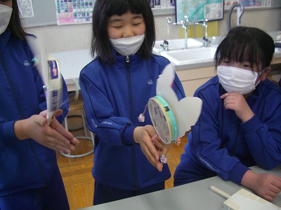 2週間かけて作った「理科で学習した内容のおもちゃ」を、みんなでお互いに発表し、遊ぶ時間です。