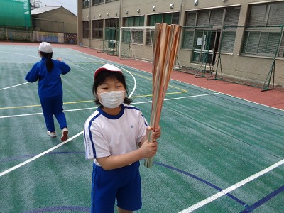 まずは、聖火リレーのトーチを持って、聖火ランナー体験をしました。