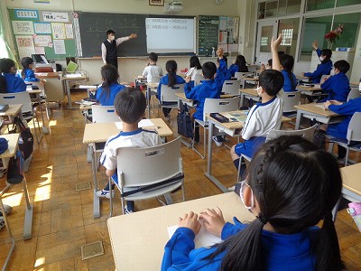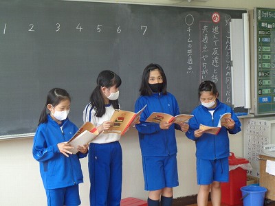 国語は、前回の学習で取り組んだ「春のうた」の音読を全員で行ったあと、「こんなところが同じだね」の単元の学習です。「進んで話合いを行う」という学習目標のもと、チームに分かれてそれぞれの共通点がいくつ見つかるかについて話合いました。
