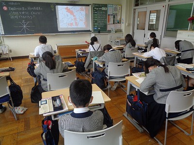 4年生の社会では、わたしたちの住む「京都」について学習することになります。まずは、自分達の住む場所が地図のどのあたりにあるのかを確かめながら、都道府県について学習していきます。今日は、京都に隣り合う周りの都道府県を「八方位」を使って説明するという学習を行いました。まずは八方位の確認から行い、いろいろな県から見て「京都はどの方位にあるのか」調べていきました。