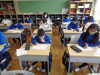 根っこタイムは「あまりのあるわり算」の計算に取り組みました。4年生では、タイムを測って計算に取り組みます。全部で50問ですが、1分台を目指して何度も練習をくり返します。