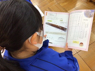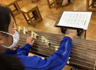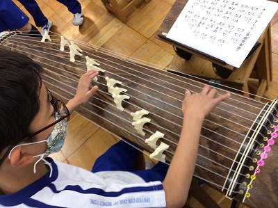 また、お琴(箏)で「♪さくらさくら」のひとフレーズを弾いてもらうため、教科書の資料ページも学習しました。弦が13本あることや、音の高さを変える“柱(じ)”のことを知りました。