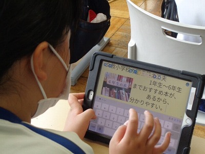 続いて「図書室の達人になろう」という学習で行った図書室の工夫調べを発表し合い、見つけた工夫をロイロノートを使ってまとめます。「同じシリーズの本がまとめて置いてある!」や、「ひらがなの札をおいて、場所を分かりやすくしてある!」など、それぞれが見つけた工夫を発表し合いました。