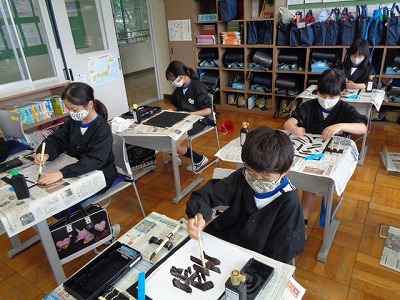 5・6時間目は書写の時間でした。4年生になって始めての毛筆です。今日は「雲」という字を書きます。雲は「あめかんむり」で、「雨」と「あめかんむり」の書き方の違いについて、クラスで確認したあと、まずは硬筆で練習をします。その後、習字セットを準備して習字を行いました。久しぶりの書道でしたが、集中して書くことができました。
