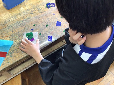 透過性のある材料を、切ったり、重ねたり、貼ったりしていきます。