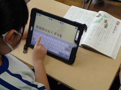 国語では、「都道府県の旅」という小単元の学習を行いました。教科書の都道府県名を見ながら、ロイロノートで名産品を調べながら短文づくりを行いました。ローマ字を打つ練習も兼ねて、教科書とにらめっこしながら、個性豊かな短文を書いてくれました。