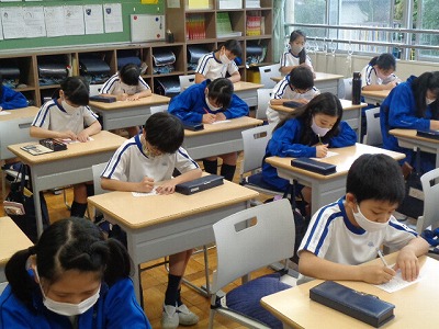 今日の朝根っこタイムは、漢字テストを行いました。毎日、漢字ドリルの文章の中から4年生の漢字を5問ずつ出題しています。5問テストにも慣れてきた様子で、満点の児童も増えてきました。4年生の漢字の学習も始まっていますが、3年生の漢字も忘れてはなりません。定着するまで何度もくり返し、練習です。